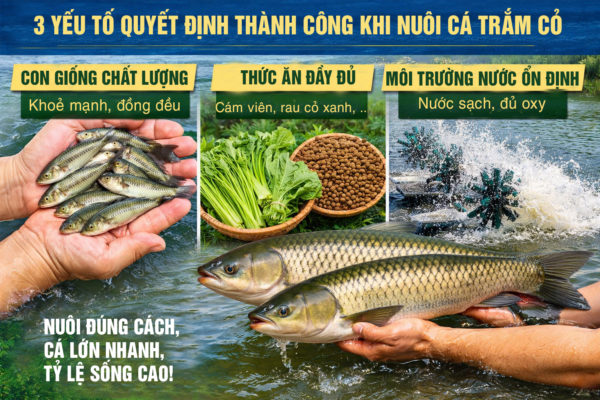 Để nuôi cá trắm cỏ đạt hiệu quả cao, người nuôi cần chú ý đến 3 yếu tố quan trọng: con giống chất lượng, nguồn thức ăn đầy đủ và môi trường nước ổn định. Khi đảm bảo tốt các yếu tố này, cá sẽ phát triển nhanh, ít bệnh và mang lại lợi nhuận cao.