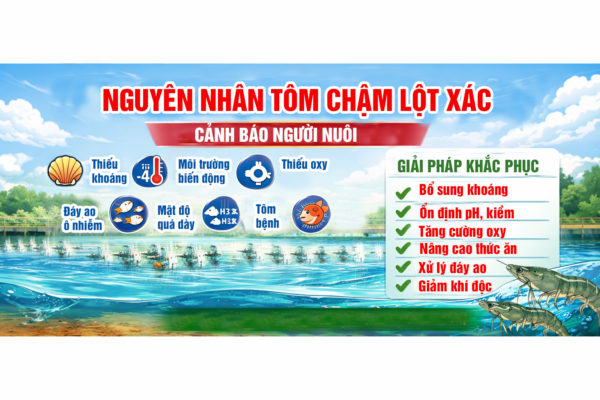 Tôm chậm lột xác là vấn đề phổ biến trong nuôi tôm, ảnh hưởng trực tiếp đến tốc độ tăng trưởng, hệ số chuyển đổi thức ăn (FCR) và tỷ lệ sống. Nếu không xử lý kịp thời, có thể gây thiệt hại lớn cho người nuôi.