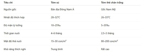 So sánh chi tiết hiệu quả giữa nuôi tôm thẻ chân trắng và tôm sú: tốc độ sinh trưởng, chi phí, rủi ro, giá bán và lợi nhuận. Bài viết giúp người nuôi lựa chọn đối tượng phù hợp để đạt hiệu quả kinh tế cao nhất.