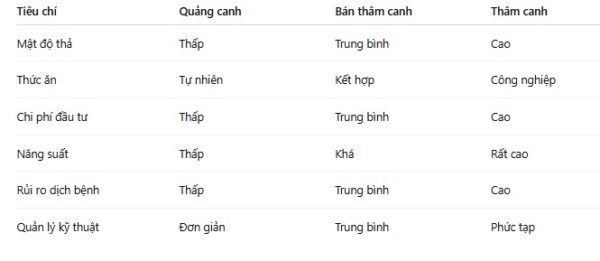 Bảng so sánh nuôi quảng canh – bán thâm canh – thâm canh