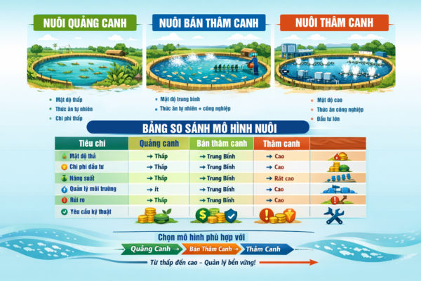 Trong nuôi trồng thủy sản, việc lựa chọn mô hình nuôi phù hợp quyết định trực tiếp đến năng suất, chi phí đầu tư và rủi ro dịch bệnh. Ba mô hình phổ biến hiện nay gồm nuôi quảng canh – bán thâm canh – thâm canh. Mỗi mô hình có ưu, nhược điểm riêng và phù hợp với từng điều kiện ao nuôi khác nhau.