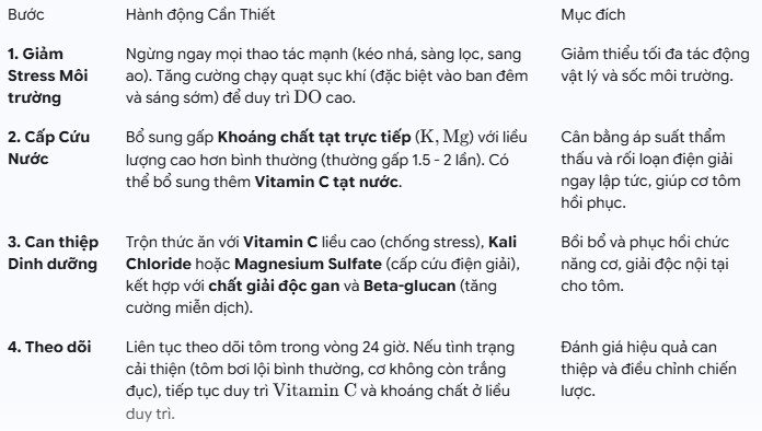 Khi phát hiện tôm bị co cơ hoặc trắng cơ, cần hành động ngay lập tức để giảm stress và phục hồi tôm.